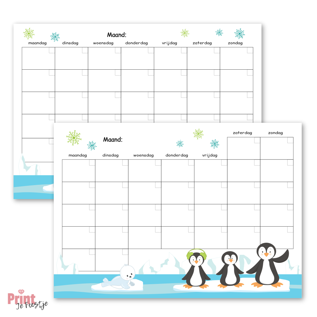 Een maandkalender met een winters tafereel van pinguïns drijvend op een ijsblok.